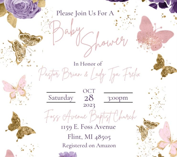 In honor of Pastor Brian and First Lady Tya Frelix, we invite you to join us for their Baby Shower for baby Violet Angel Frelix! Saturday, October 28th, 2023 at 3:00 pm. You can find the registry on Amazon.com.